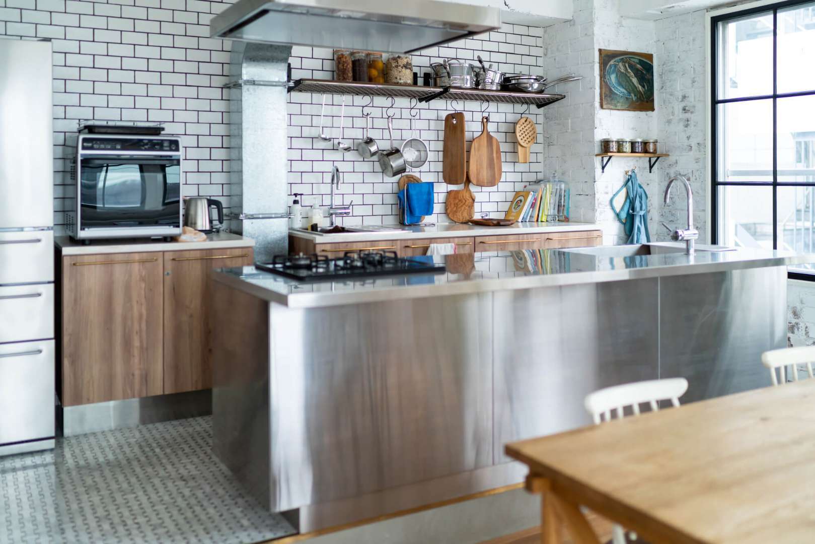 「インダストリアル・スタイル」は床をモルタル(あるいはモルタル風のクッションフロア)や土間にしたり、アイアン系の家具を取り入れるのがポイント。キッチンのダクトをむき出しにすると、さらに工場らしい雰囲気が出せますよ。