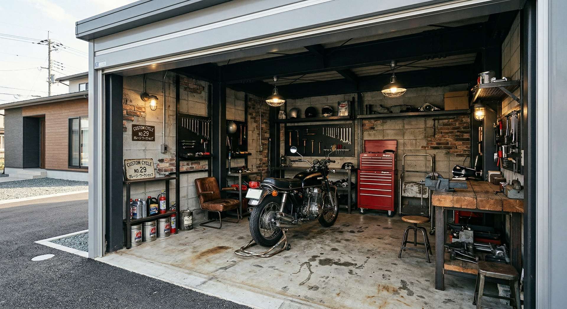 古い工具や看板、ビンテージの金属小物などを飾ると、さらに味わい深くなります。照明の無骨な光がそうしたアイテムを優しく照らし、まるで昔の工場にタイムスリップしたような感覚に。ガレージは単なる作業場から趣味の空間へと変貌します。